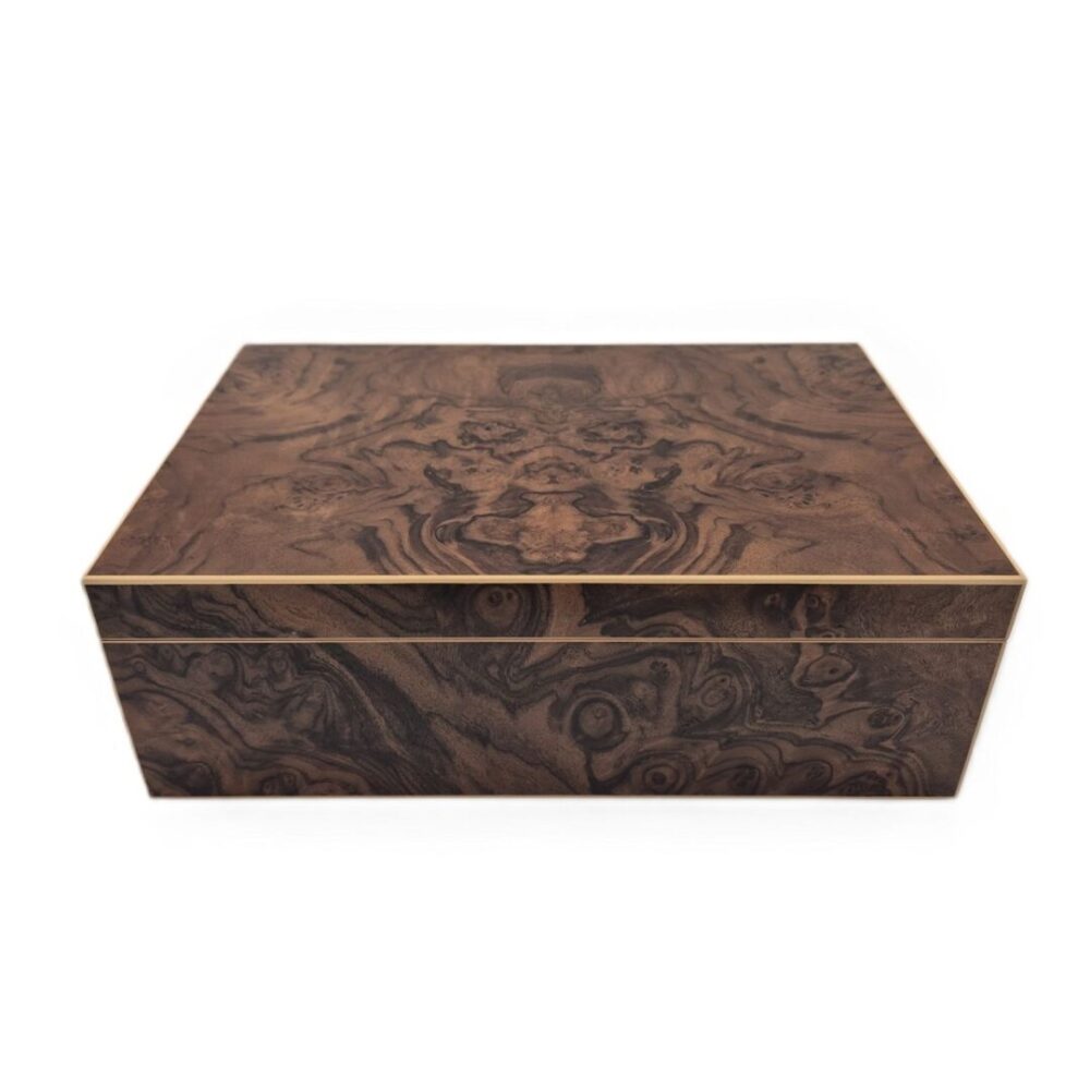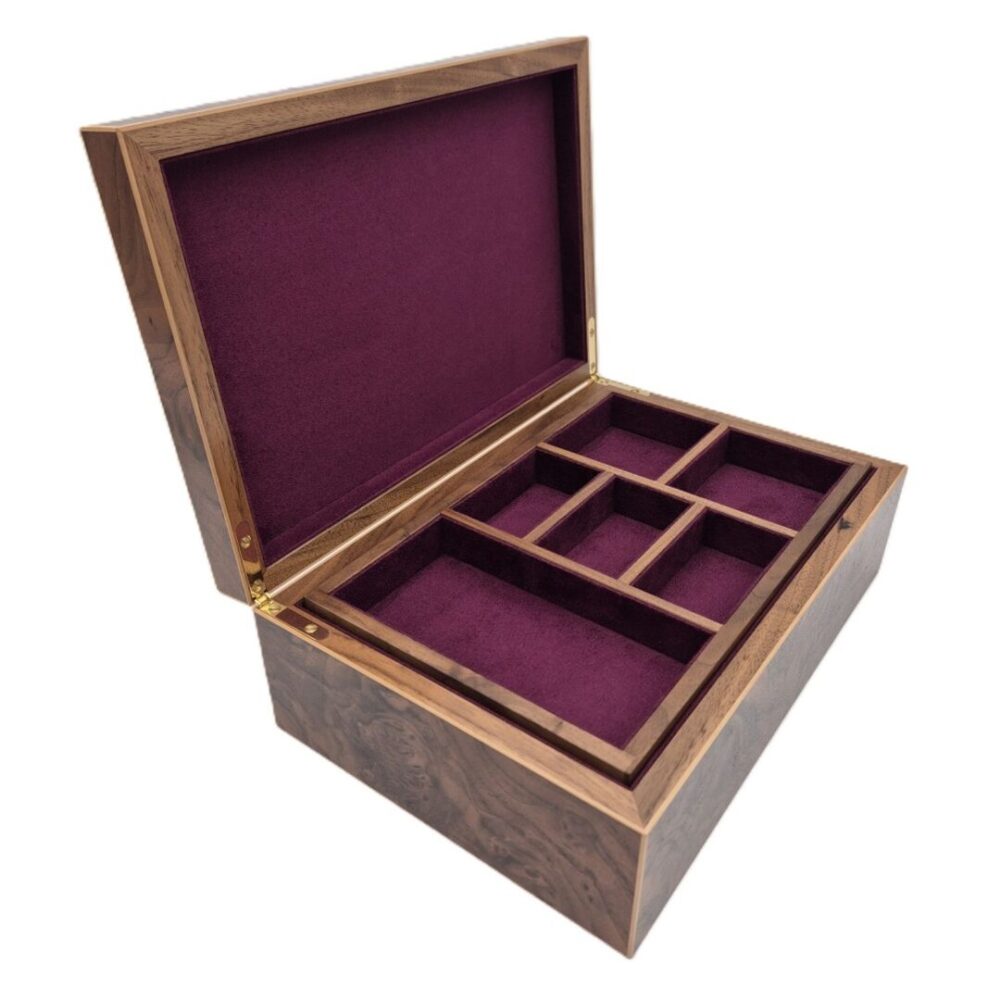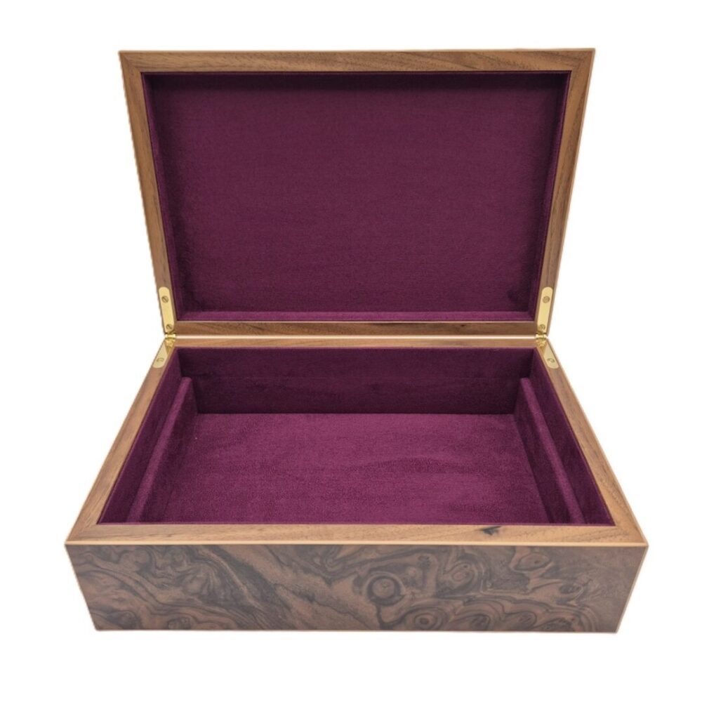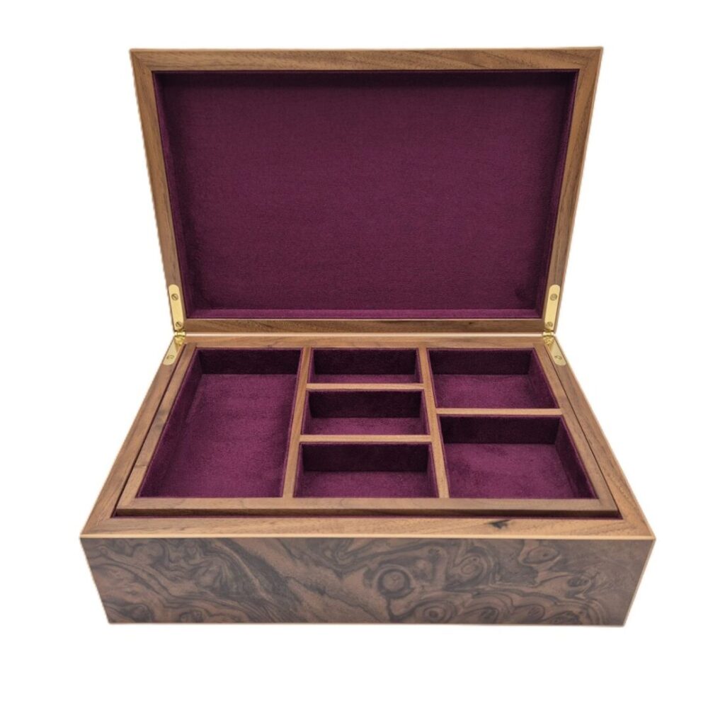 This is a classic design jewellery box, lovely walnut burr veneer trimmed on all edges with white boxwood stringing, and a book-matched panel gives a significant visual effect to the lid. It has a nicely proportioned lift-out tray with a 35mm void area below for larger items. Fitted with solid brass hinges and lined with a luxurious purple faux suede.